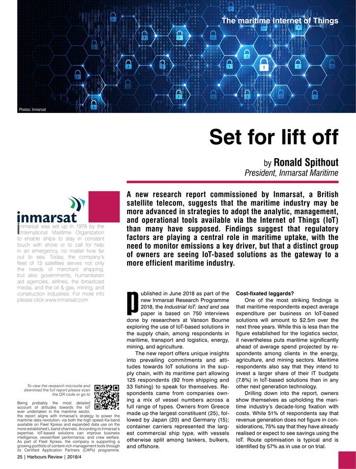 A new research report commissioned by Inmarsat, a British satellite telecom, suggests that the maritime industry may be more advanced in strategies to adopt the analytic, management, and operational tools available via the Internet of Things (IoT) than many have supposed. Findings suggest that regulatory factors are playing a central role in maritime uptake, with the need to monitor emissions a key driver, but that a distinct group of owners are seeing IoT-based solutions as the gateway to a more efficient maritime industry.