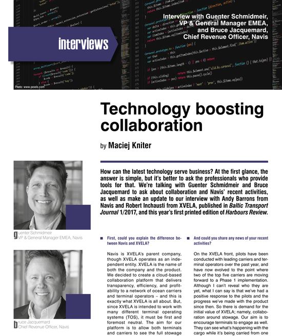We’re talking with Guenter Schmidmeir and Bruce Jacquemard to ask about collaboration and Navis’ recent activities, as well as make an update to our interview with Andy Barrons from Navis and Robert Inchausti from XVELA, published in Baltic Transport Journal 1/2017, and this year’s first printed edition of Harbours Review.