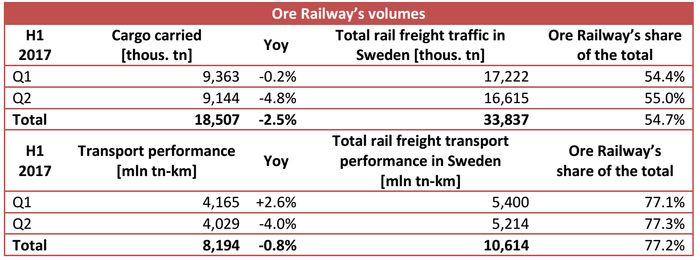 Transport performance across the rail line which serves traffic between mines in the North of Sweden and the Norwegian Port of Narvik totalled 8,194 mln tn-km in the reported period (-0.8% yoy).