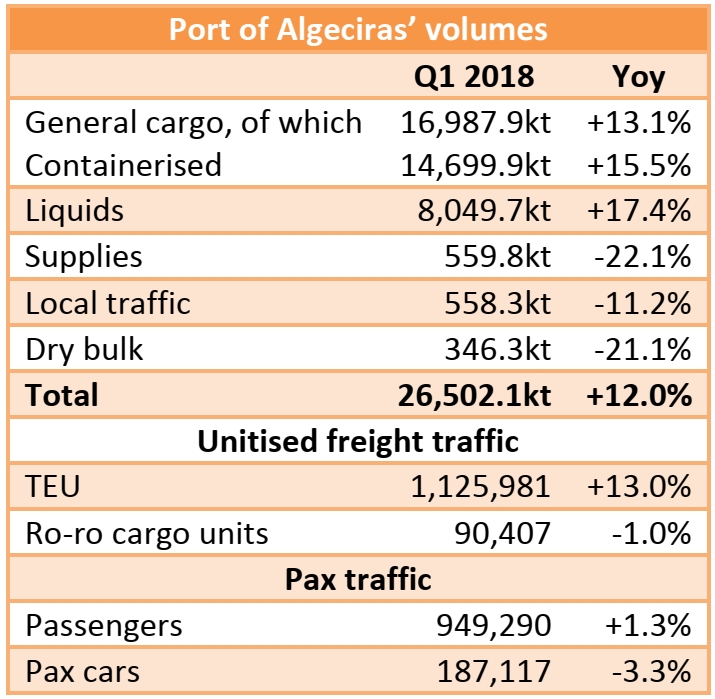 In total, the Spanish port’s freight throughput for the first quarter of this year totalled 26.5mt, more by 12% on the Q1 2017 result.