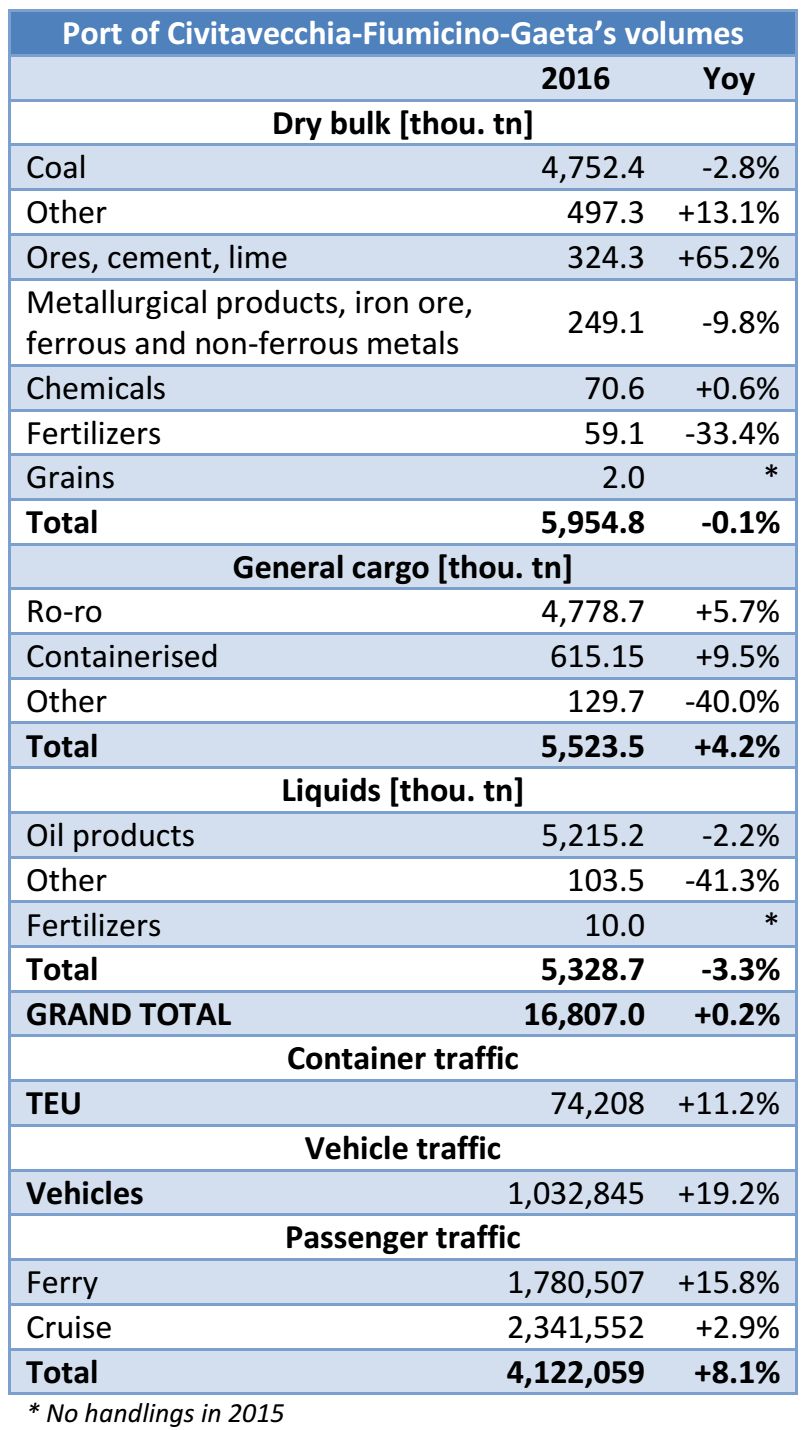 Market SMS Port of Civitavecchia-Fiumicino-Gaeta: 16.81 mln tn handled in 2016 (+0.2% yoy)