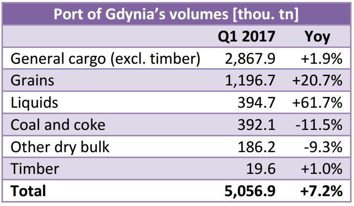 In total, almost 5.06 mln tn were made in Gdynia over the course of this year's first three months, an increase by 7.2% year-on-year.