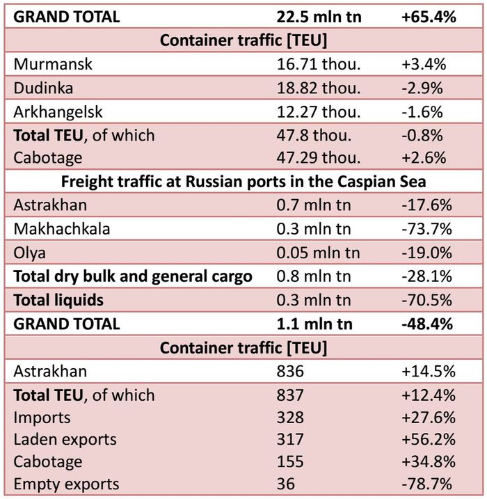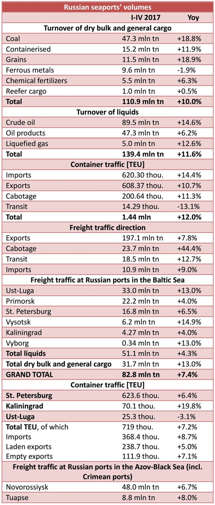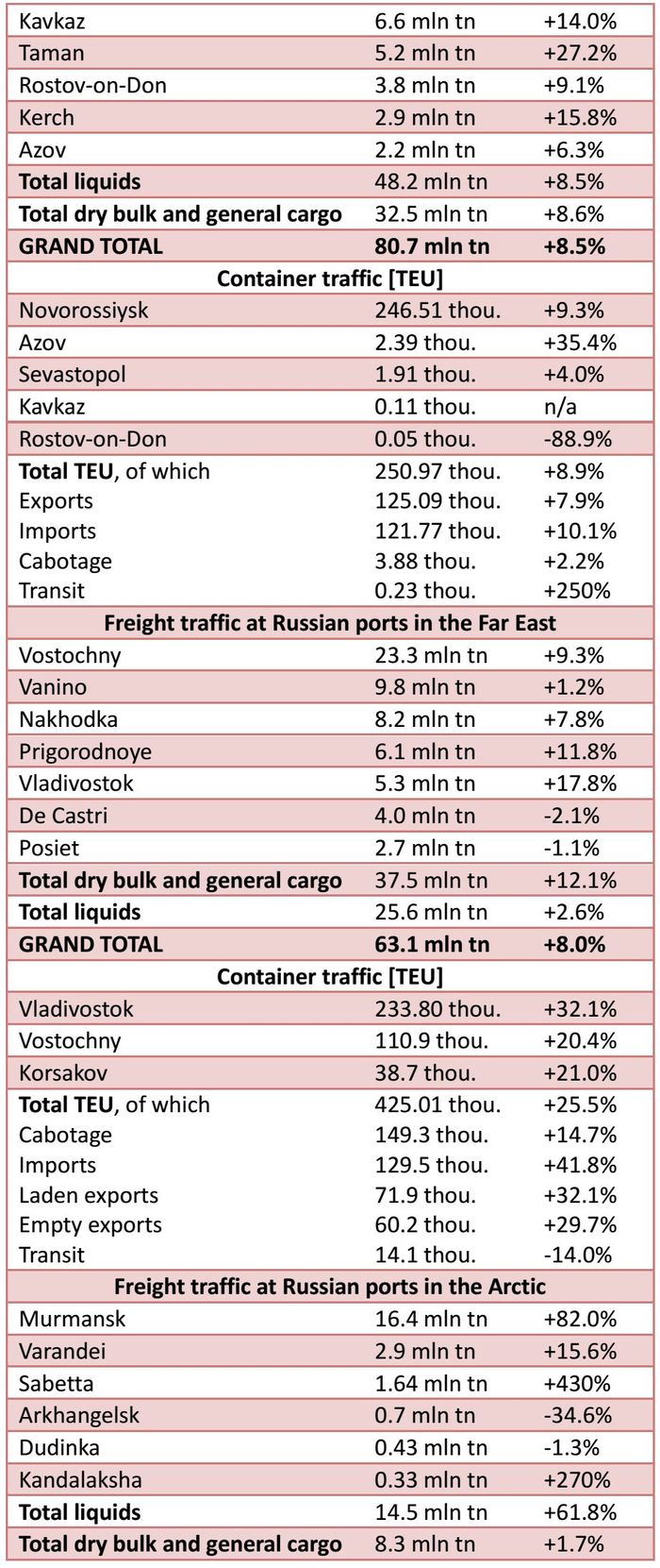 With 82.8 mln tn handled (+7.4% year-on-year), the Baltic Sea holds the biggest share in Russian ports' overall freight handlings within the reported period.