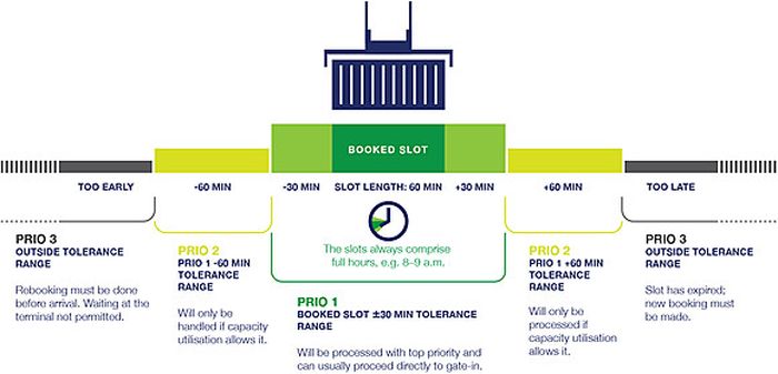 Each time slot lasts one hour, within which the truck is handled with a maximum priority at the container terminal. If the driver misses this slot, then he is handled with a lower priority, provided there is capacity at the terminal. If the driver comes much later, the slot is lost and he must make a new booking.