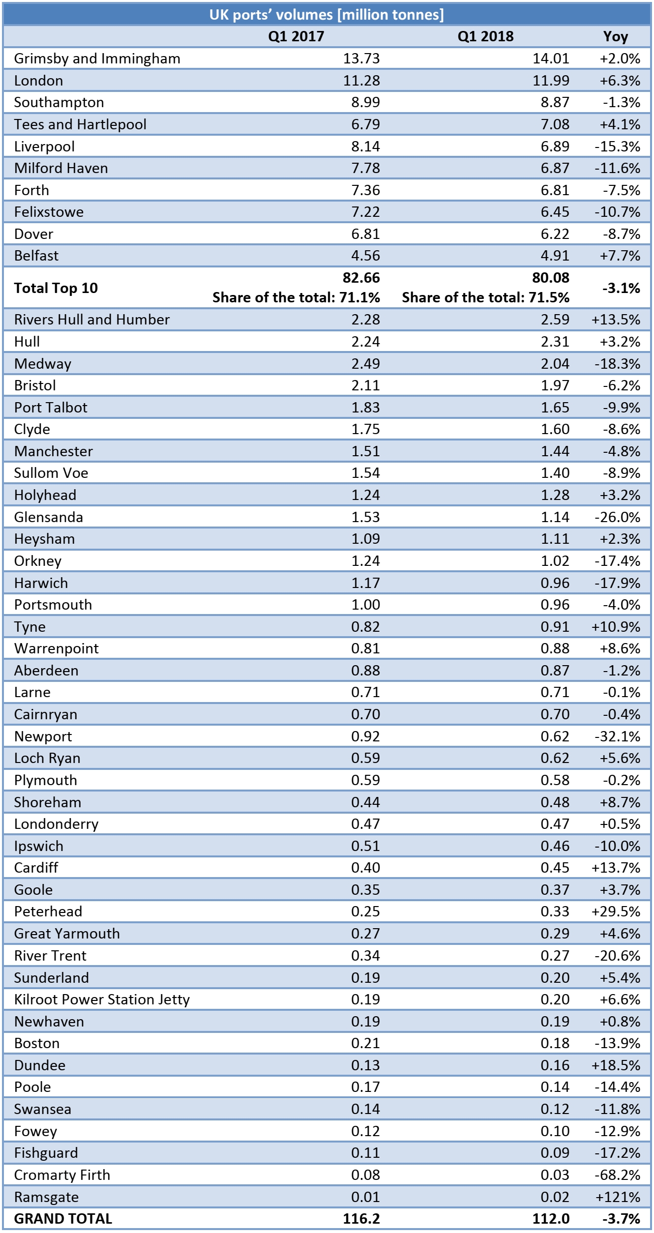 While the Top 10 ports in the United Kingdom handled less cargo over 2018’s first quarter than in the corresponding period last year, their actual market share rose.